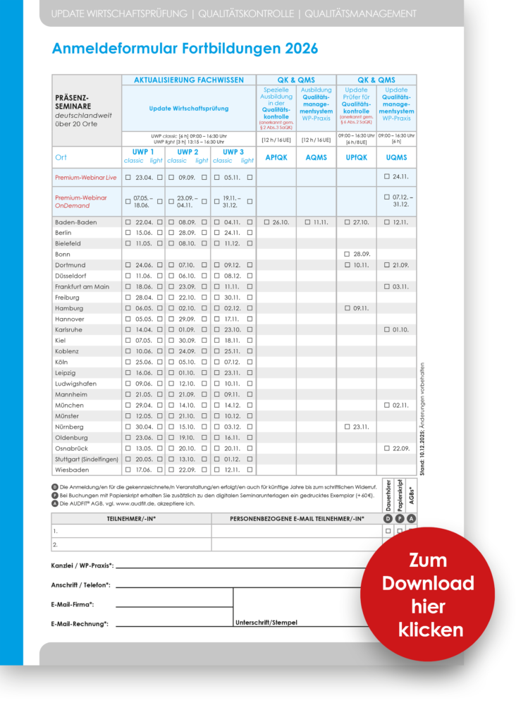 Gerne können Sie uns auch an seminare@audfit.de eine E-Mail mit Ihren Buchungswünschen senden.